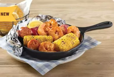 The Campfire Beef meal comes with slow-braised beef, sweet corn on the cob, red skin potatoes, carrots, grape tomatoes, and onions, all seasoned with campfire spices and cooked slowly in foil to lock in a flavorful butter broth. It’s served with your choice of Buttermilk Biscuits or Corn Muffins.