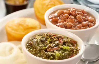 A hearty, traditional Southern combo of pinto beans, turnip greens, and sometimes cornbread depending on location. High in fiber and packed with flavor.